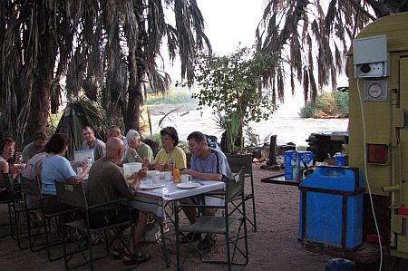 Frühstückstisch mit Personen unter Palmen mit einem Fluss im HintergrundZweitägiger Aufenthalt bei den Epupa Wasserfällen mit Besuch eines Dorfes des Stammes der Ovahimba. Kurzwanderung entlang der Epupa Wasserfälle zu Aussichtspunkten. Fahrt via Opuwo durch Siedlungsland der Ovahimba.